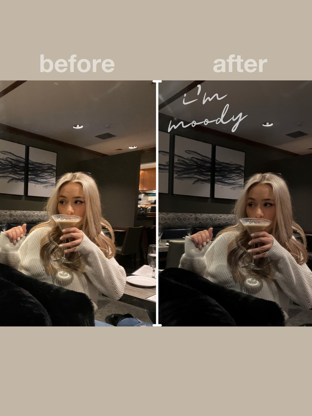 Use "IM MOODY" to edit any photo! I use this preset to make my photos dark/moody. I love this for a moody feed which is super trendy right now! Super fun to have to jazz up a boring photo! I love that everyone is keeping their feed more natural & this is an easy way to achieve that! I get so many DM's daily asking how I edit my pictures and now I can share that will you guys! xoxo
